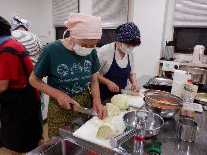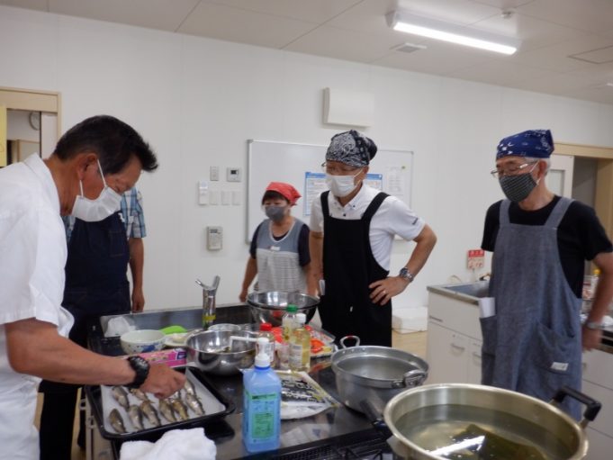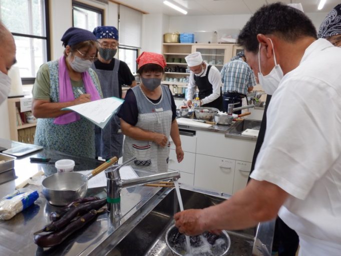 みんなの料理第2講を7月20日(水)に開催、男女会員9名が参加し、大山公民館調理室で4品調理しました。今回も講師は穴井喜文さんです。