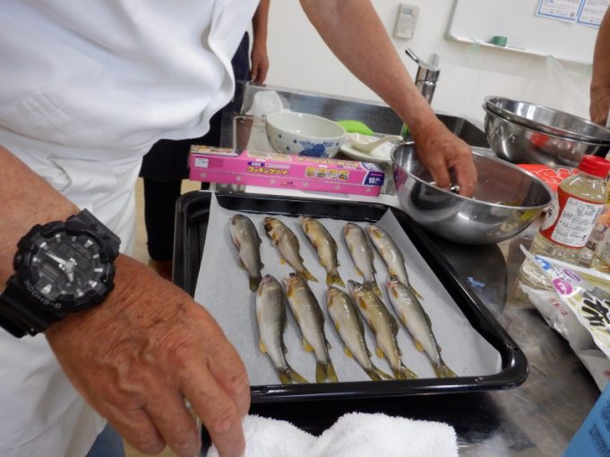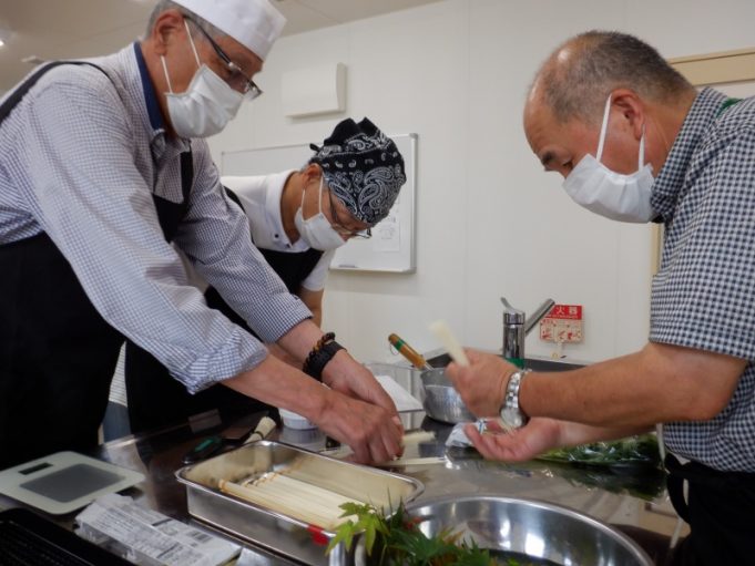 茄子を「翡翠色」に仕上げる調理法、「そうめん」を料亭のような見た目に飾りつける方法、みょうがの千切り方法、鮎の身はそうめんのトッピングに、頭と骨はつゆのだしに使うなどたくさんの和食調理のコツをおしえていただきました。