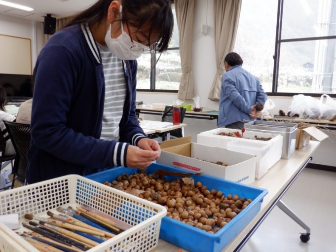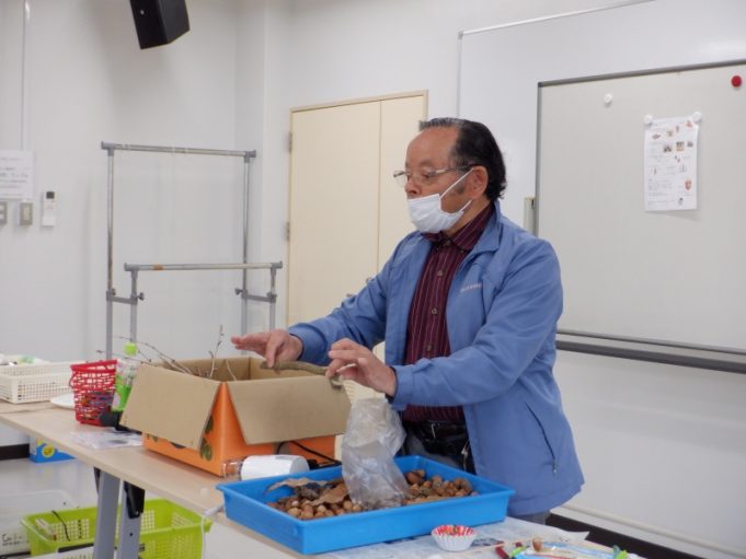 「どんぐり」と一口にいっても「ナラ」「カシ」「クリ」など様々な種類があることを勉強します。作業にあたっての注意事項などを聞いて、材料選び。