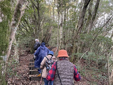 あいにくの小雨の中でしたが時々晴れ間のある天気でした。古田先生から木の名前やの由来を聞きながら森林浴を楽しむことが出来ました。樹木は古来より多くのことに利用されてきました。種類も多くこの烏宿神社周辺はカシ、シイ、タブなどの典型的な照葉樹林ということでした。