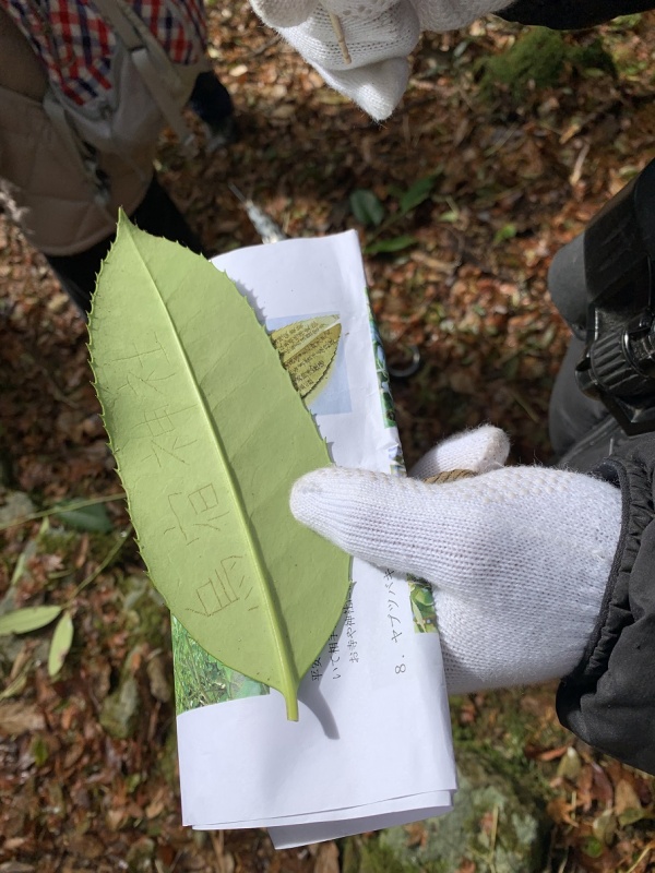 木の香りも楽しみました、「ミズメ」という木はサロンパスの匂いがしました。「タラヨウ」通称エカキシバはかって葉の裏に文字を書いていたそうです。写経や、手紙などに利用されたそうです。みんなで爪楊枝で文字を書いてみました。時間がたてば文字がくっきりと見えてきました。
