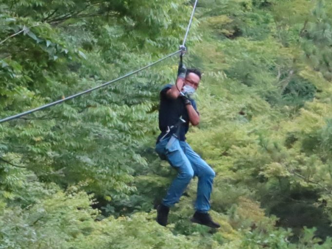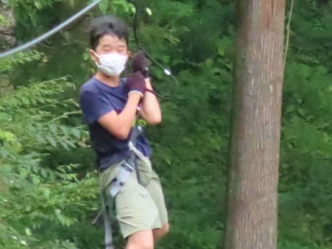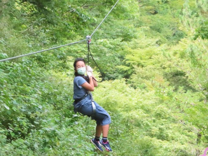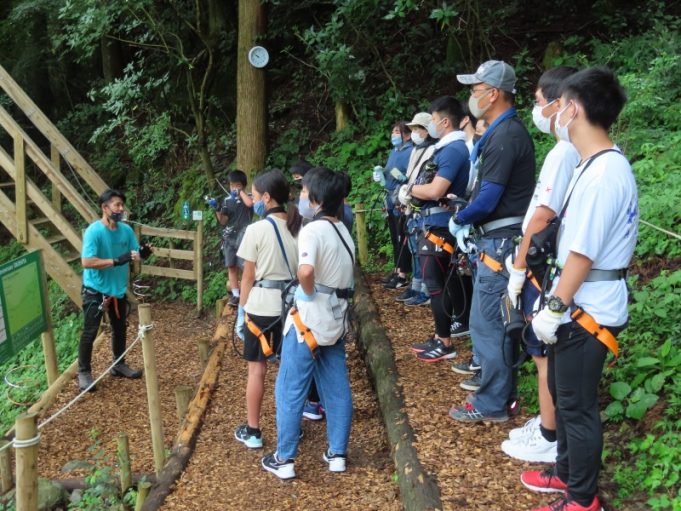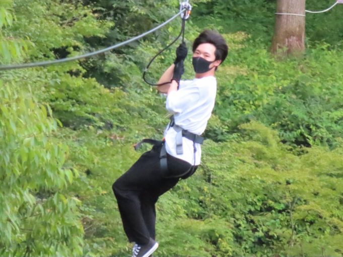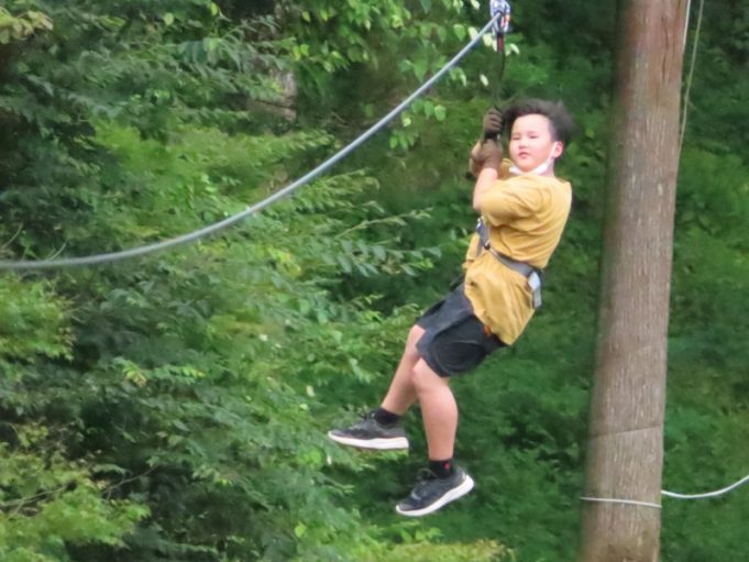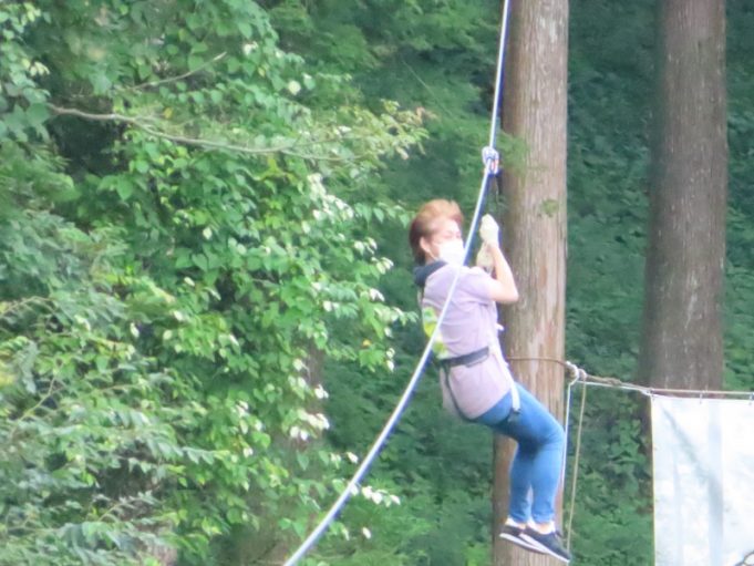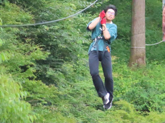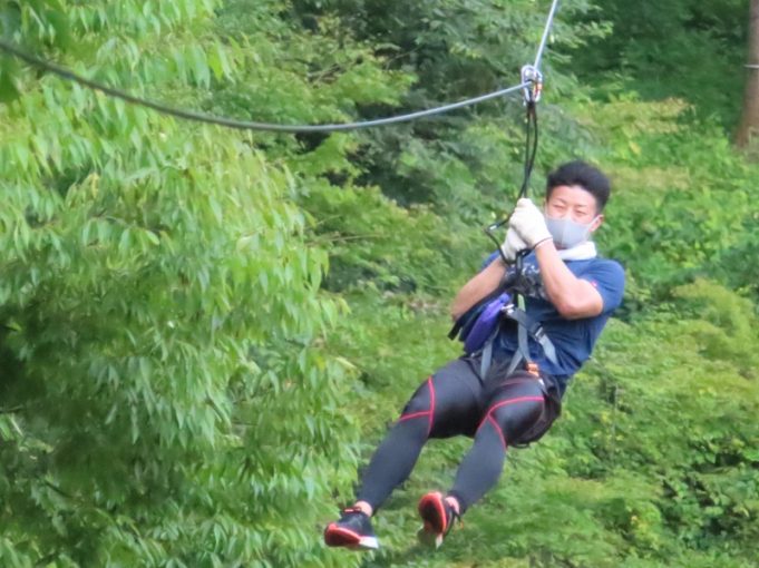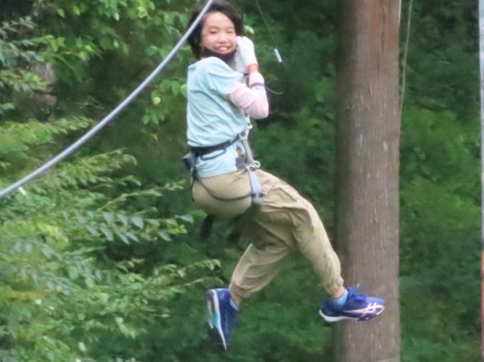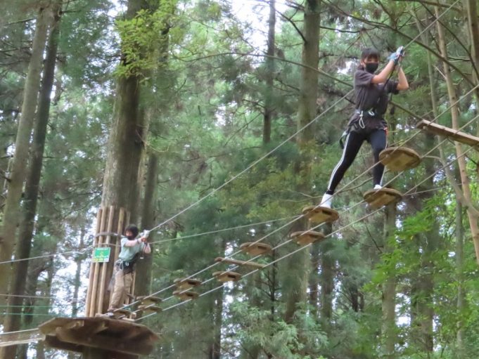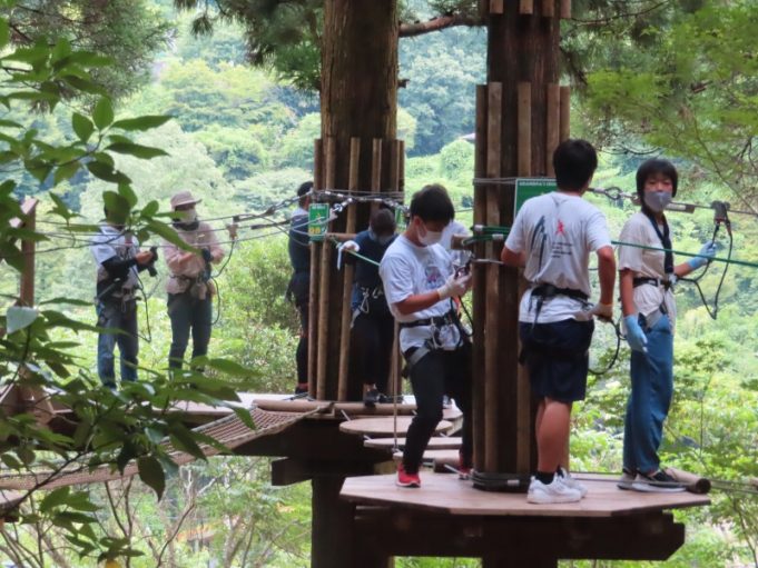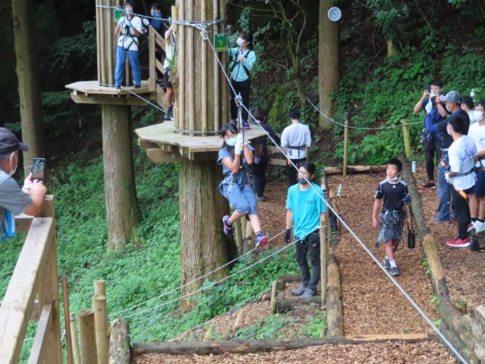 大山っ子チャレンジ教室受講生は8月8日、中津江にある「フォレストアドベンチャー奥日田」でアドベンチャー体験を行いました。今回は保護者同伴、一緒に活動しました。