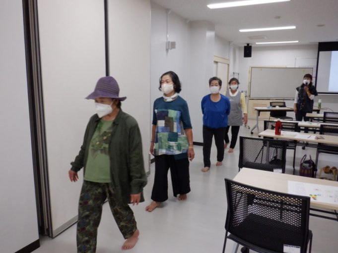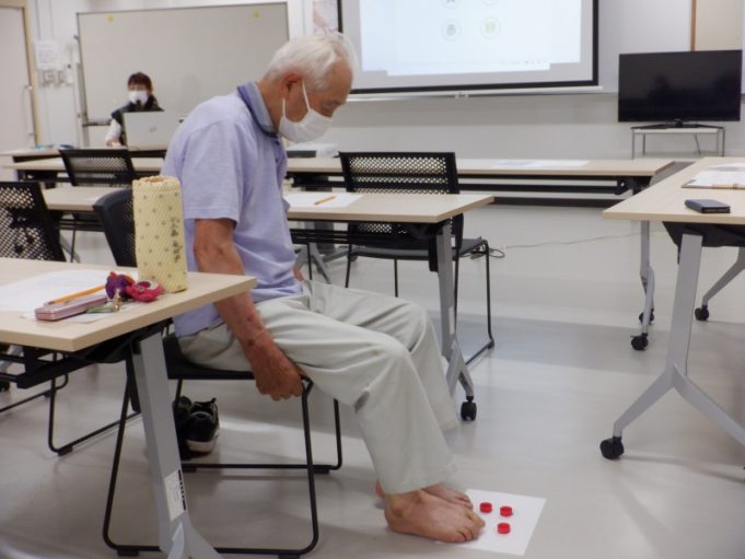 杖を持った人の90%が「屈み足」足にあっていない靴をはくと屈み足になり運動機能が低下、猫背になるとのことで、足の指を曲げで歩く体験をしてみました。「上手に歩けない!」