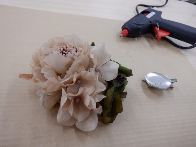 リボン上にお花の配置を決めたらグルーガンで固定していきます。