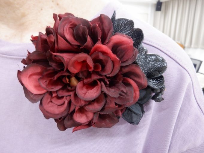 「コサージュといえば、入学式、卒業式、結婚式など特別なイベントの時にしかつけないイメージがありますが、このコサージュはシックでお洋服に馴染むので普段使いを楽しんでもらいたいです」と加藤さん。バッグなどに付けるのもおしゃれです。