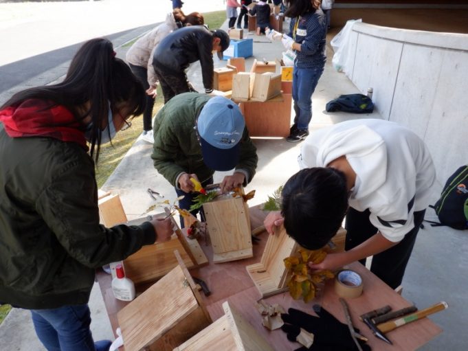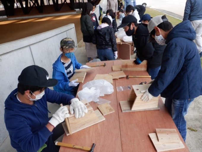 10月24日(土)「大山っ子チャレンジ教室」と「前津江ジュニア倶楽部」合同による「鳥の巣箱作りともみじ谷探検」を田来原美しい森づくり公園で行い、児童21名が参加しました。