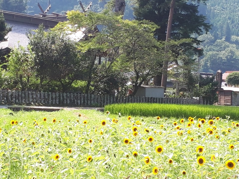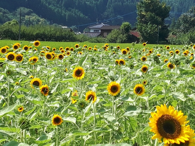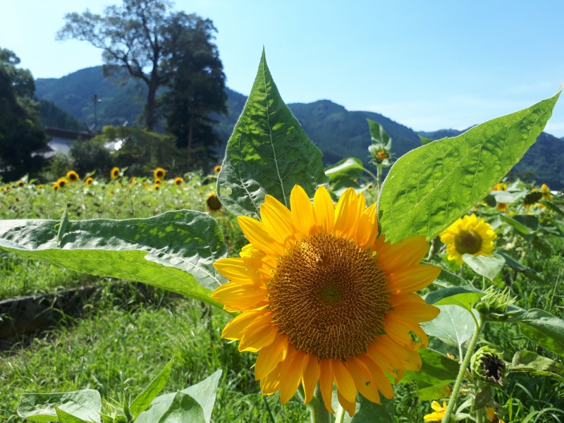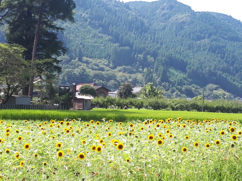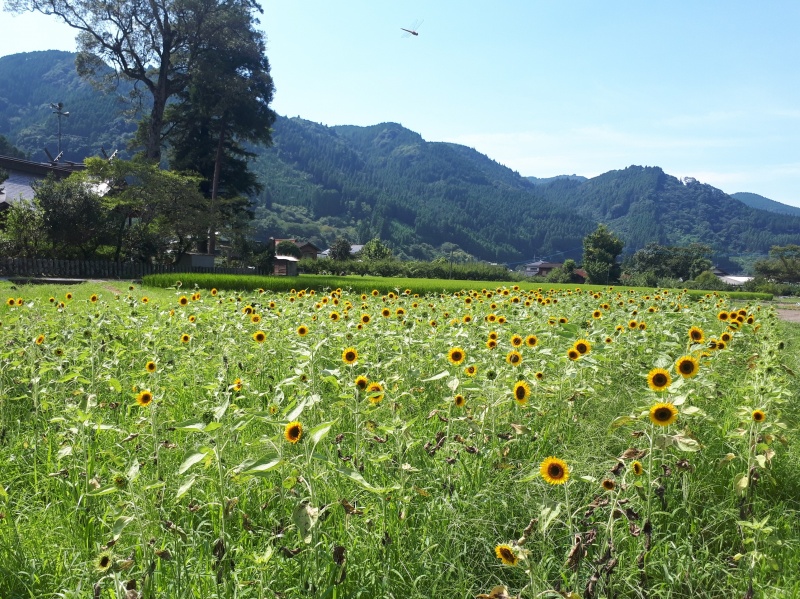 6月18日(日)、大山町の清流自治会 小五馬地区で植えられた向日葵が順調に成長!!(大山町集落支援員 主催)