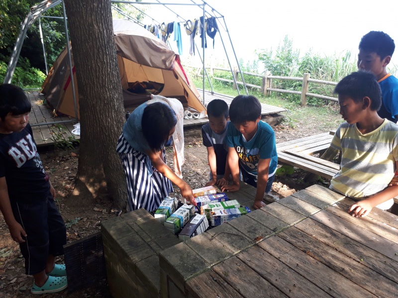 サマーキャンプ、3日目。朝ごはんのカートンドッグです。キャンプ場の最後のごはんです。