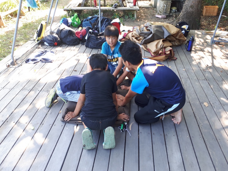 片付け。調理器具もテントもきれいに。厳しいチェックがはいります。