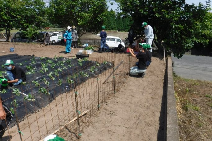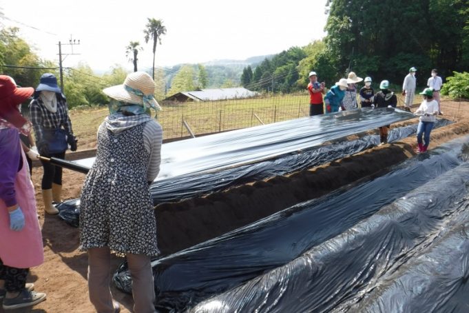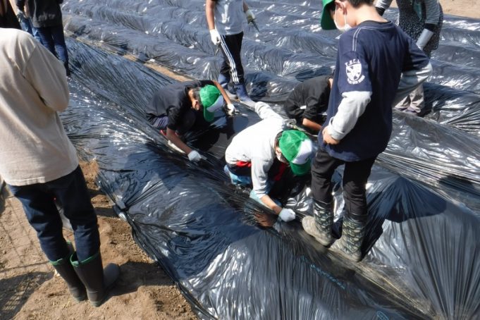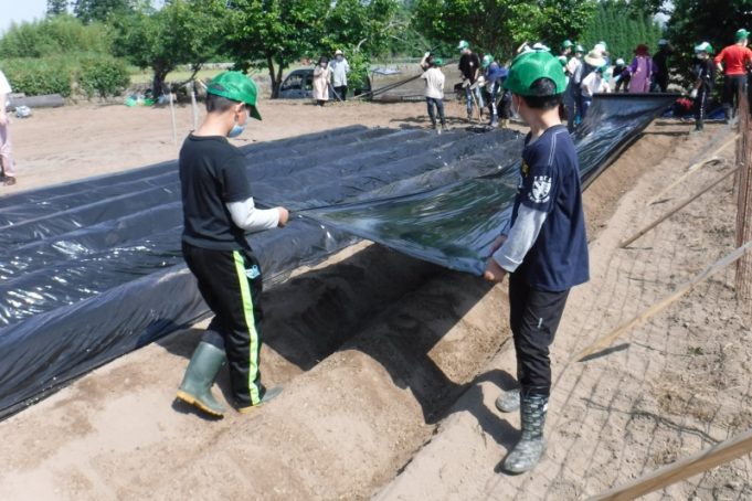 残りの班員は黒マルチを張る体験をし、その両端にマルチトンボを1.5M間隔で留めていき、苗植えの準備を行いました![]()