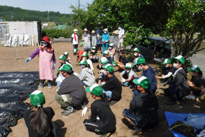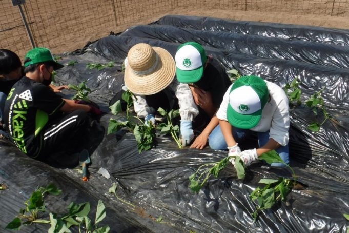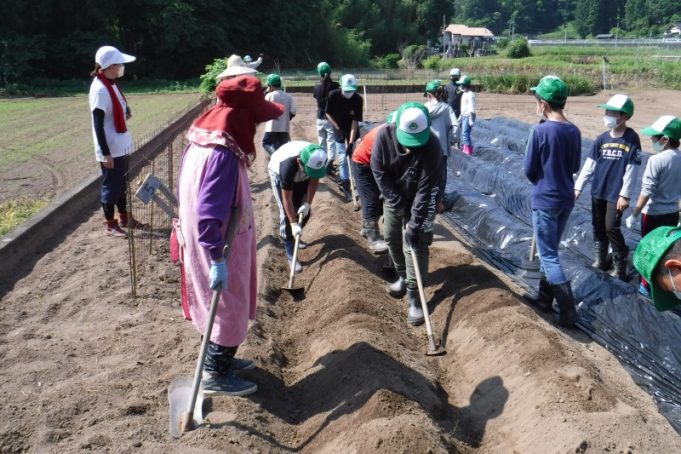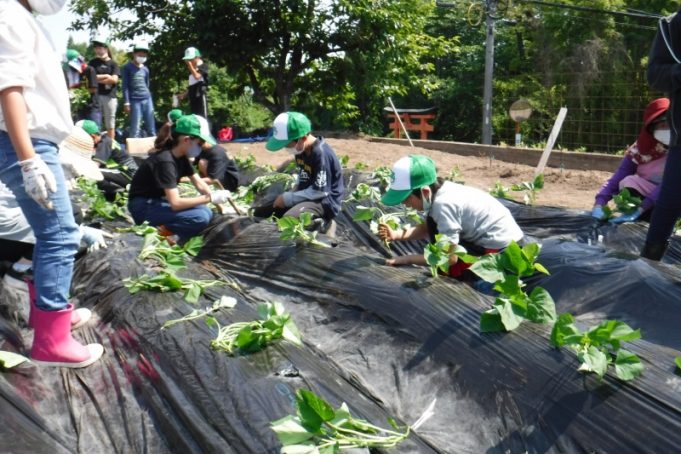 次に各班に分かれて、30センチ間隔で黒マルチにスコップで穴をあけていき、さつまいもの苗を配置。配置した苗を手の平くらい土に埋めて、苗植えを行っていきました![]()