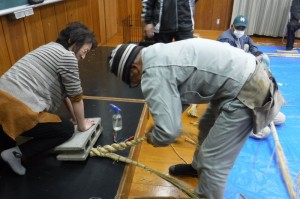 しめ縄作りは結構力が必要で、参加した女性の方々は先生に手伝ってもらいながら、藁を綯っていきました
