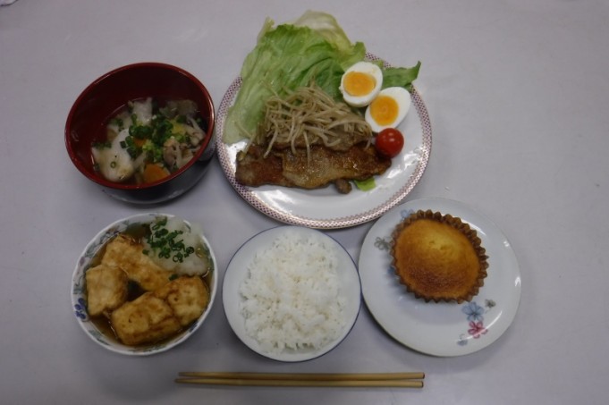 今回のメニューは、豚の生姜焼き・揚げ出し豆腐・お雑煮・マドレーヌです
