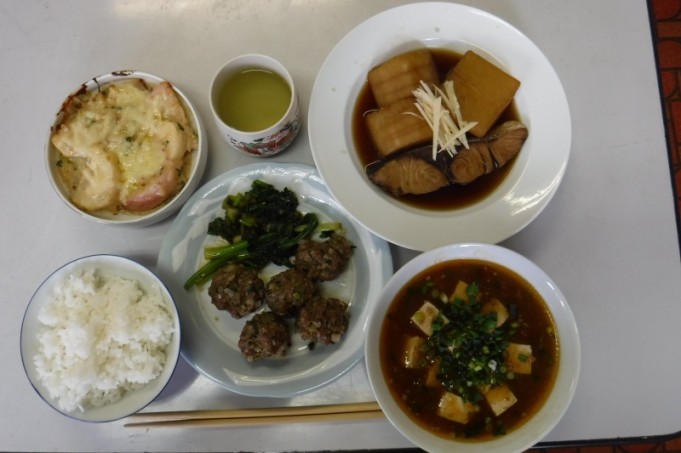 今回のメニューは、小松菜の皮ナシシューマイとマーボースープ・味しみブリダイコン・サワラとカブの和風グラタンです
