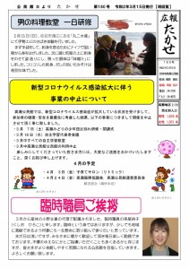 表面には、男の料理教室一日研修の様子、公民館事業中止お知らせと臨時職員のご挨拶。