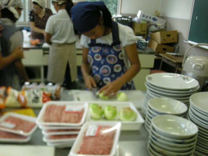 ボランティアの方の指導を受けながら、玉ねぎを切って行きます。