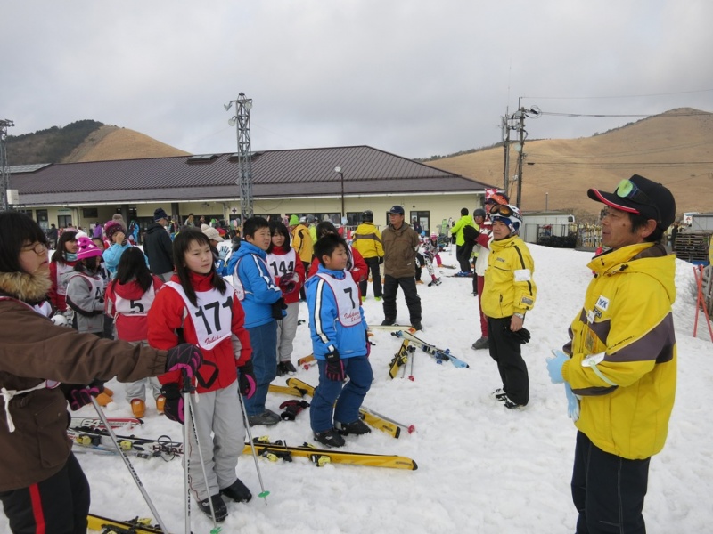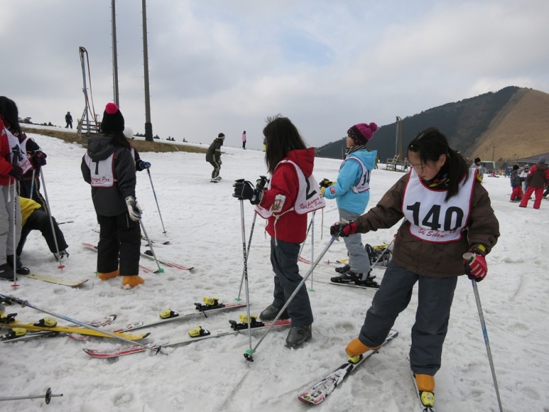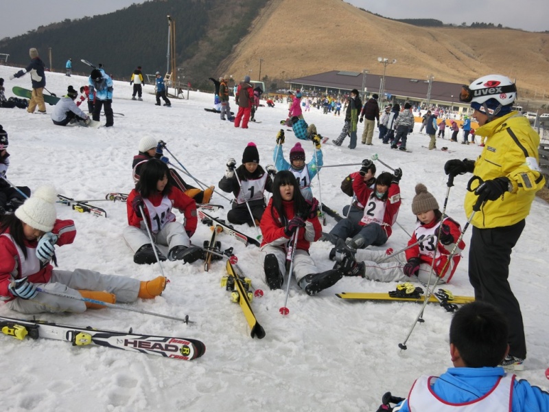 九重スキー場着後、早速スキーウェアに着替えスキー靴を履き、スキースクールに入校。