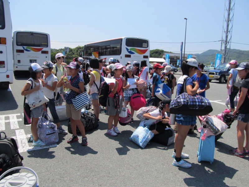 いざ到着。といっても今回のサマーキャンプ実施場所の「玄海の家」は道路が狭く大型バスが入っていくのが難しいため、近くの「道の駅むなかた」で下車して約600mほど歩かなければいけないのです。