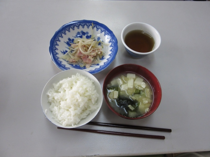 ごはん・みそ汁にベーコンともやしの炒め物。