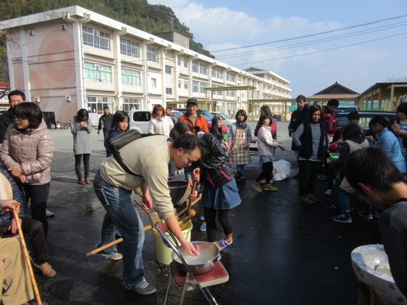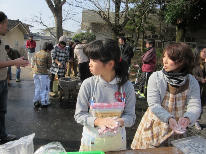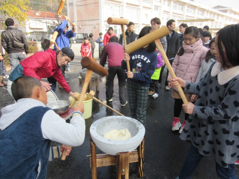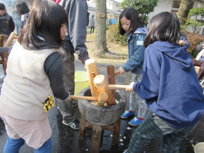 ミニ門松づくりが終わった頃、体育館の所では餅つきの準備が出来ていました。