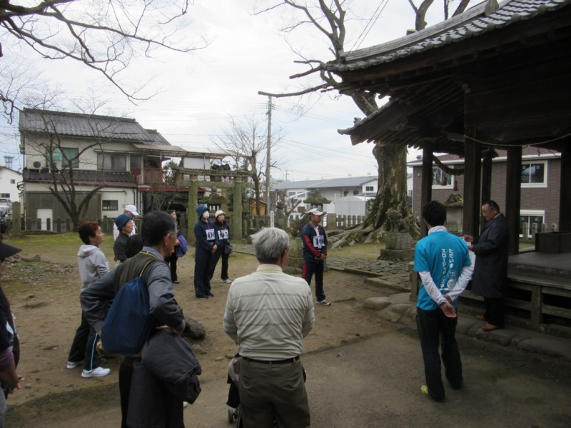 玉垂神社の説明を聞く参加者の皆さん。