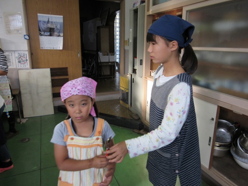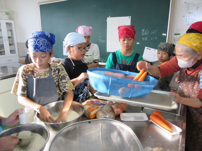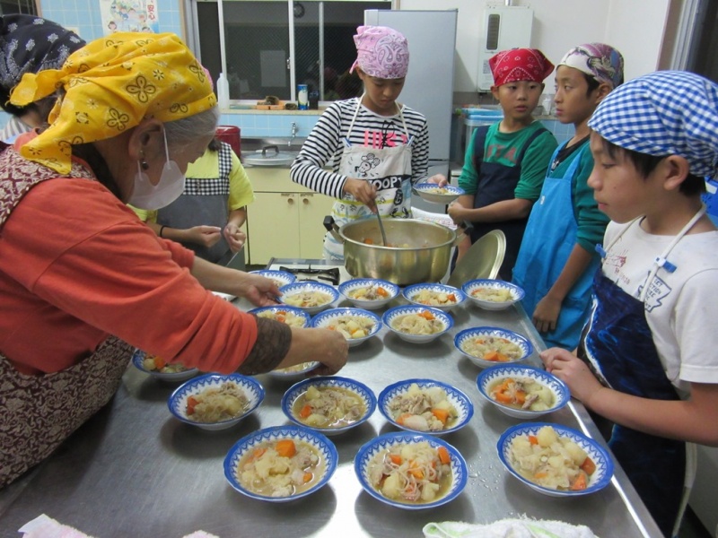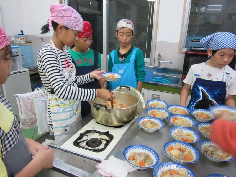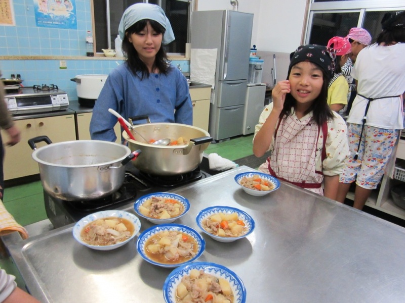 野菜の皮をむくくらいしかしていないのですが、子どもたちが一生懸命がんばっていた姿と真剣な様子に心打たれたボランティアの女性方が、煮込んだ方がおいしいからと、お風呂に行っているあいだにやってくれたようです。