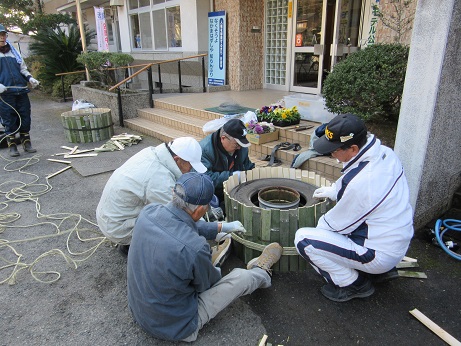 13日(金)に準備をした竹を使い、手慣れた様子で門松を立てていきます。