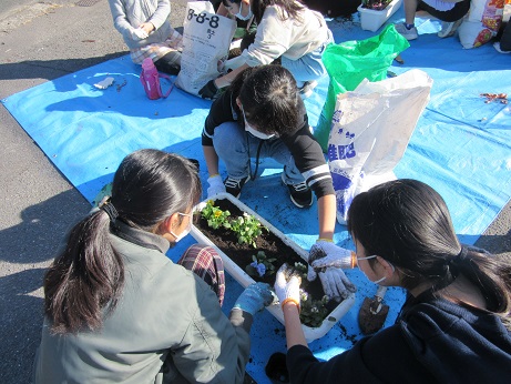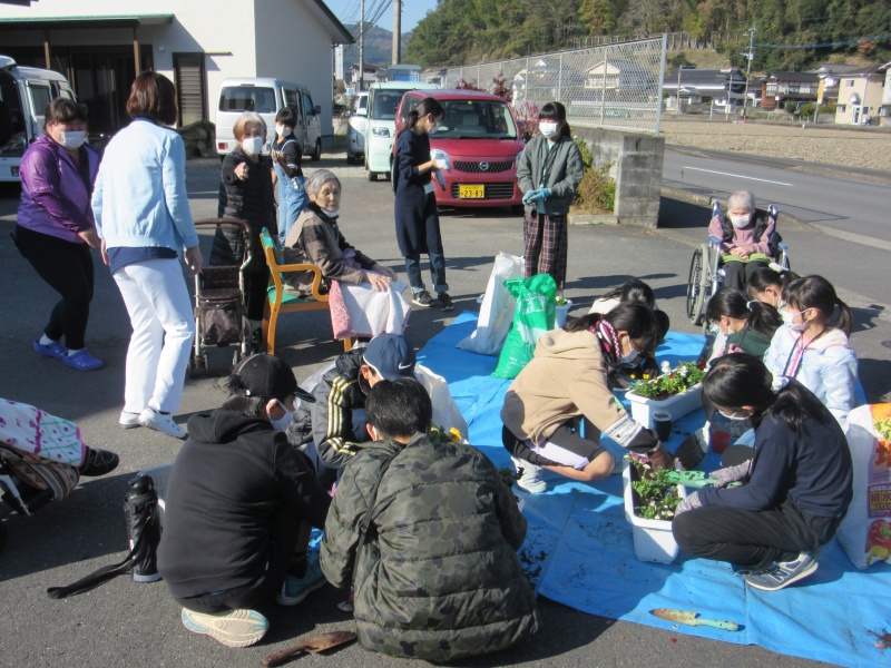 北友田1丁目にある高齢者のデイサービス・老人ホーム施設において、高齢者の皆さんに喜んでいただこうと、花の寄せ植えと参加児童による手書きのクリスマスカードをプレゼントしました。