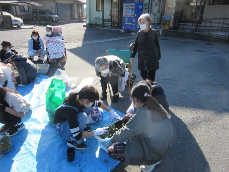 花の寄せ植えは施設の駐車場で高齢者の皆さん方が見守る中で実施。天気が良く、気温も上がったため、何人か外に出てこられて子どもたちが花苗やチューリップの球根を植える姿を見守りました。
