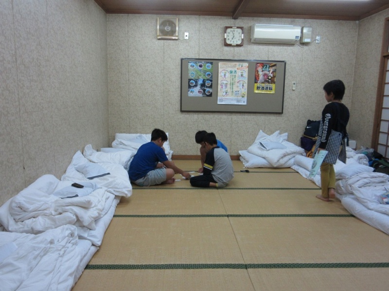 右側が女子の部屋。今回は男子12名・女子18名となりましたので、一人のスペースは1畳しかありませんでした。ほぼみんなで雑魚寝状態。でもそれがまた楽しいようです。