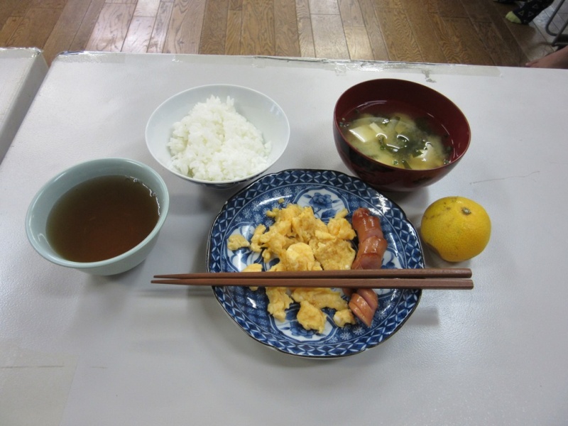 今朝のメニューは、ごはん・みそ汁・スクランブルエッグ・ウインナー・みかん