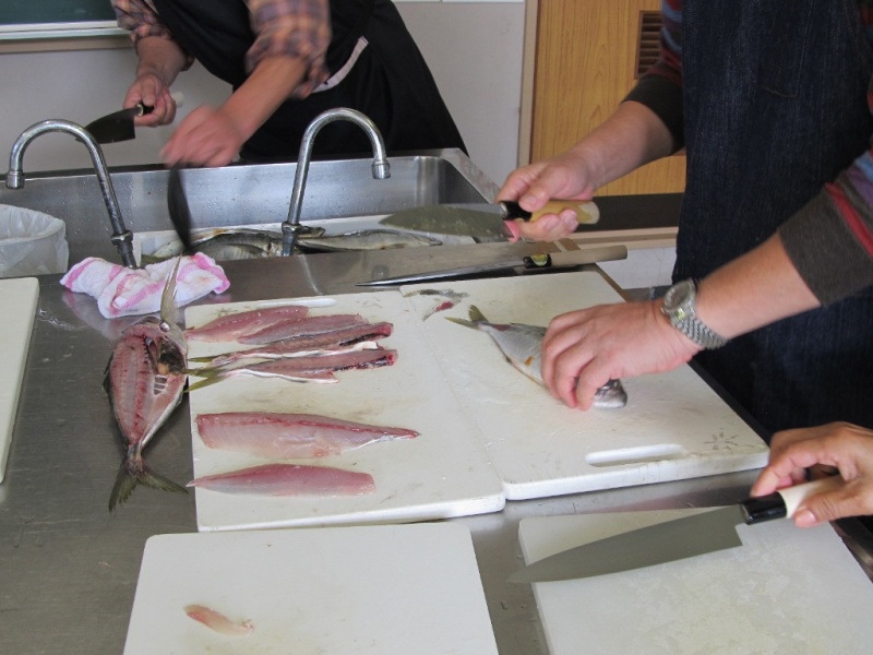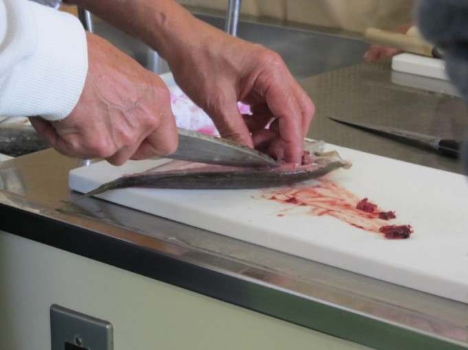 一人ずつ、アジをさばいて行きました。