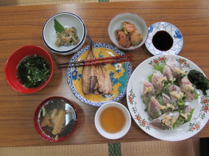 寿司・揚げ物・焼きアジ・なめろう・吸い物と5種類ものメニューが出来上がりました。