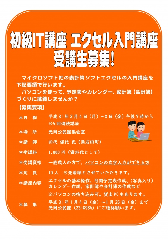 平成30年度初心者IT講座の第2弾「エクセル入門講座」を、2月4日(月)~8日(金)の5回連続講座で行いました。