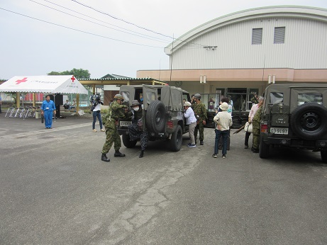 午前9時、防災訓練の開始を告げるサイレンが鳴らされ、光岡地区の多くの住民の方が小学校に集まり、訓練に参加。小学校から遠い地区においては要介護者救助訓練も行われ、高齢者の方が自衛隊の災害車両に乗って小学校まで避難をするなど、災害時並みの訓練が行われました。