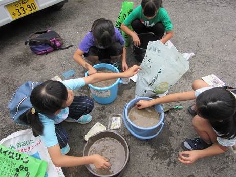 バケツに土を入れて水を入れ、しっかりとかき混ぜます。が、これがけっこう子どもたちには骨折りました…。