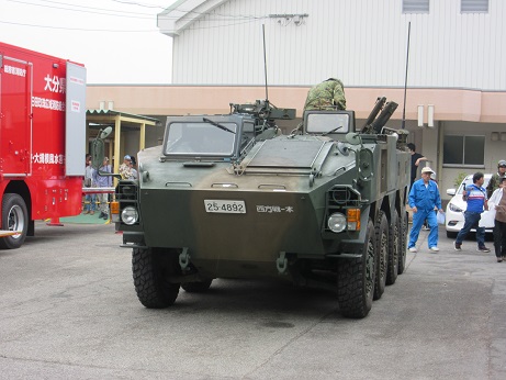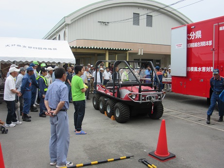 屋外では、今年日田消防署に配備された緊急災害援助隊車両が展示され、同車両に搭載される水陸両用バギーや自衛隊の装甲車など、多くの方が興味深そうに見学していました。