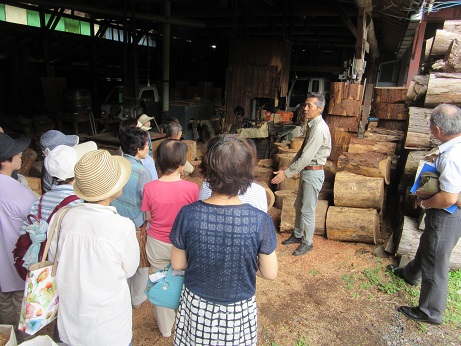 続いて、下駄の材料であるスギやヒノキから、下駄枕という下駄の基礎となる材料をつくっている清岸寺町にある猪熊製材所を見学。日田市内で建材用の木材が切り出されるとき、下駄に使う根株の部分を切り出して下駄の原材料としているとのこと。工場にはたくさんの大きな材木が保管されていました。