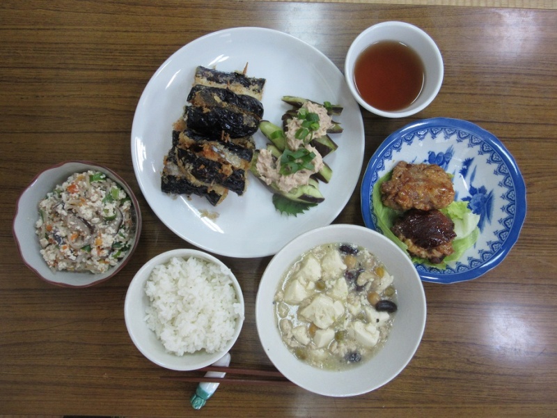 献立は、冷凍玉子の肉巻き照り焼き、なすと鮭のサンドフライ、白和え、蒸しナスのツナマヨかけ、トウモロコシと豆腐のとろみ炒めの5品。