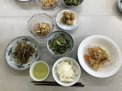 郷土食料理教室は、前津江町赤石の梶原三代さんに指導いただき、里芋の煮びたし、鶏むね肉の酢和え、野菜のかき揚げ、フキ炒め、からし菜の酢味噌和えなど地元で採れた野菜を食材に料理しました。柚子胡椒の製造・販売をしている梶原さん。今回の料理にも柚子胡椒が多く使われ、かき揚げの衣にも柚子胡椒を入れるなど、柚子胡椒の幅の広さを学ぶことができました。