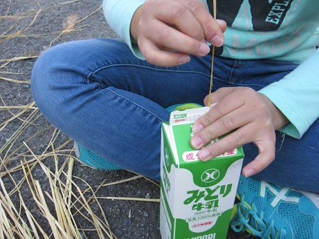 稲穂を牛乳パックに差し込み、パックの口を閉じたらゆっくりと穂を引き抜くと、米がパック内に落ちる、という寸法。