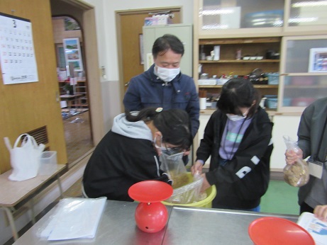 まだ熟成しきれていないお味噌ですが、麹の「くさーい!」臭い(子どもたちの感想…)を耐えて仕込んだ桶に入った仕込み味噌を保護者の皆様にも見ていただくことができ、良かったです。