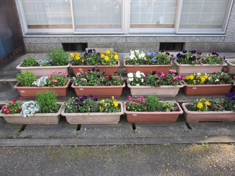 パンジーやビオラ、デージーなどを花苗を植えたその下に、チューリップの球根を植えていたのが咲いたもので、桜の開花に合わせるように満開となり、高齢者施設を彩っています!