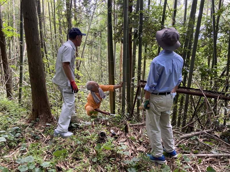 ソーメン流しの準備で男の居場所の方々が竹の切り出し、設置まで行っ