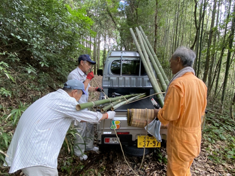山で竹を切り出して光岡公民館へ運び、ソーメン流しの長さに竹