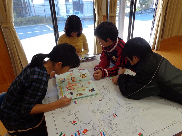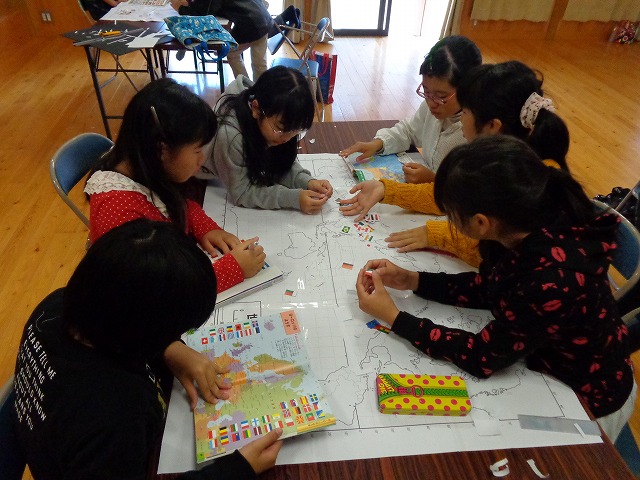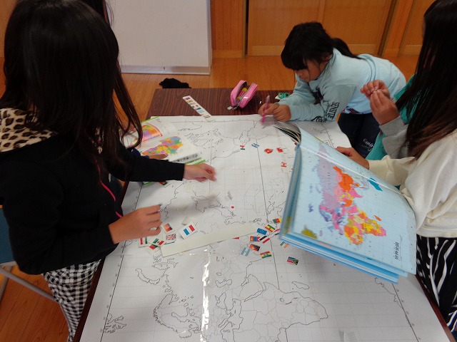 事前学習は、3グループに分かれ、大きな世界地図に国旗のシールを貼ること