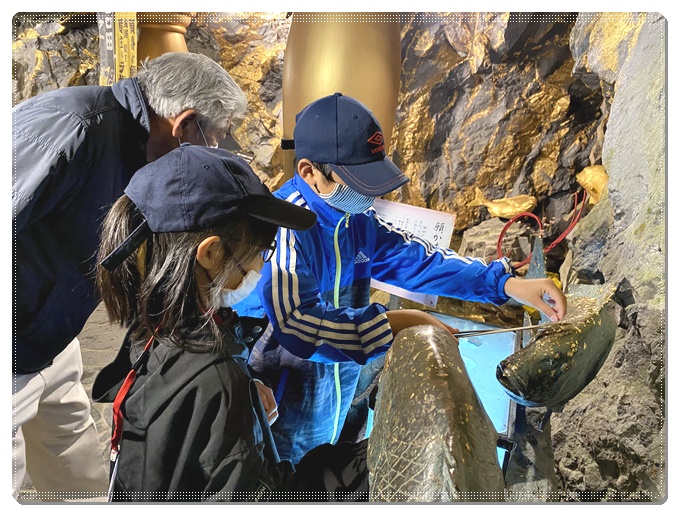 鯛生金山名物の「金の鯛」に触るとなにかご利益があるらしい。小学生がまさか「宝くじ当選祈願」をした訳ではないだろうが……