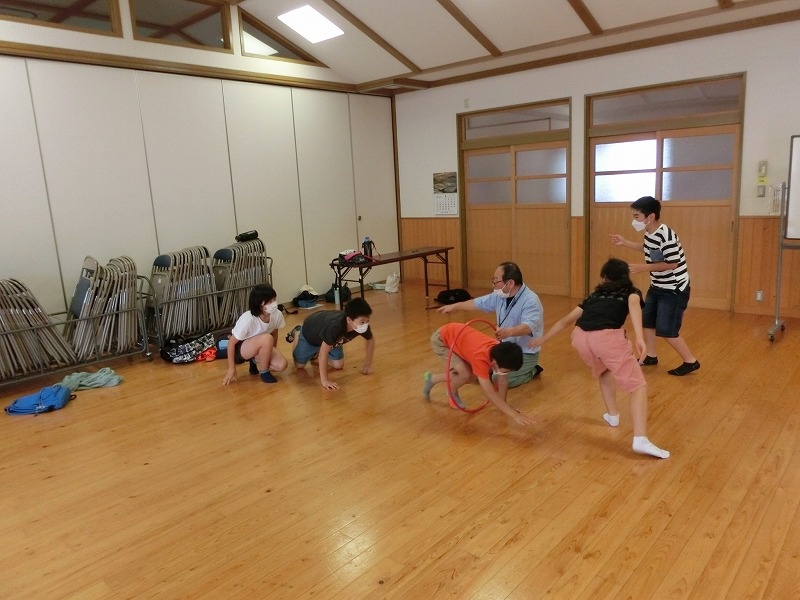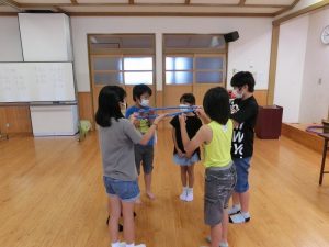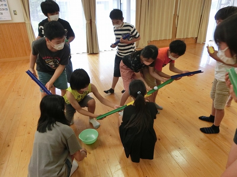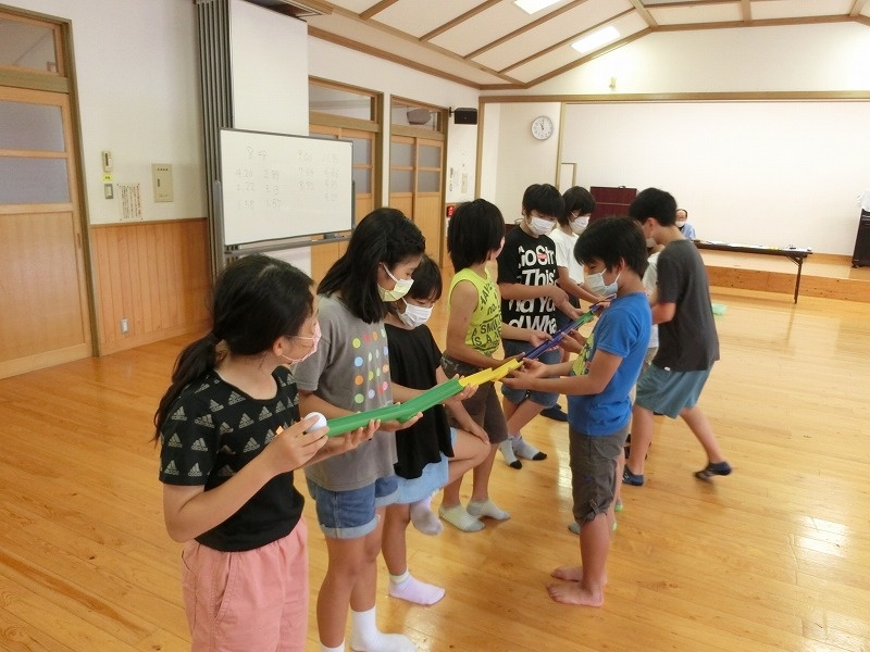 2チームに分かれて、ボールやフラフープを使った