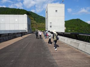 スクールバスで移動 大山ダム周辺をウォーキング
