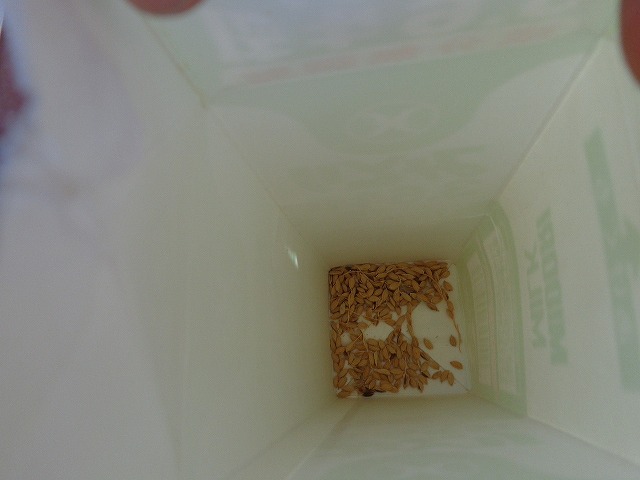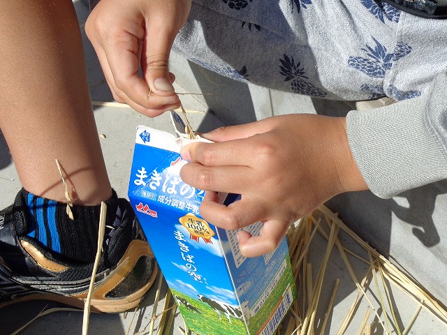 空の牛乳パックを使って脱穀をし、すり鉢とソフトボールを使って